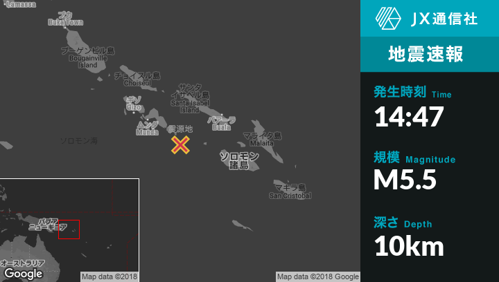 9月20日 14:47頃、ソロモン諸島のDadaliから南西132kmの地点でM5.5の地震がありました。