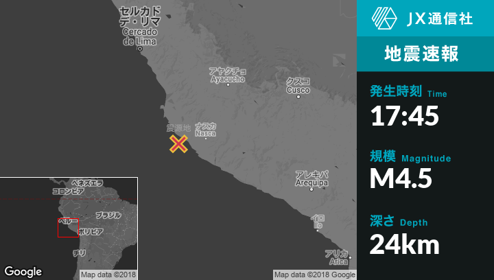 | 震源地 | ペルーのPalpaから西南西76kmの地点 |