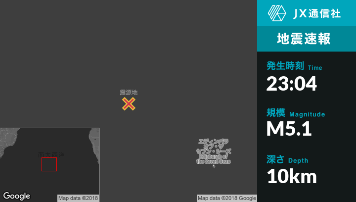 9月20日 23:04頃、セントヘレナのEdinburgh of the Seven Seasから北西425kmの地点でM5.1の地震がありました。