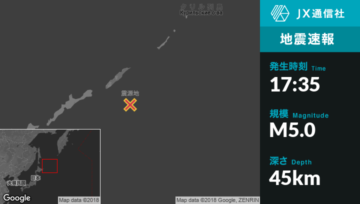 9月22日 17:35頃、ロシアのKuril'skから東209kmの地点でM5.0の地震がありました。