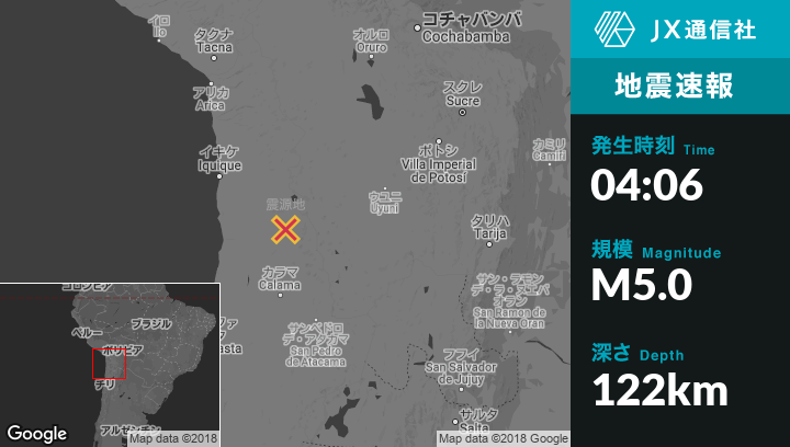 9月24日 04:06頃、チリのCalamaから北149kmの地点でM5.0の地震がありました。