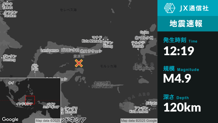 3月17日 12:19頃、インドネシアのGorontaloから南73kmの地点でM4.9の地震がありました。