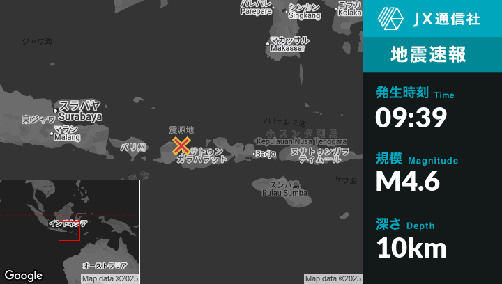 8月10日 09:39頃、インドネシアのLabuan Lombokから北北東29kmの地点でM4.6の地震がありました。