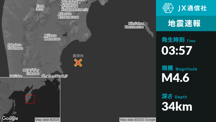 | 震源地 | ロシアのPetropavlovsk-Kamchatskyから東北東180kmの地点 |