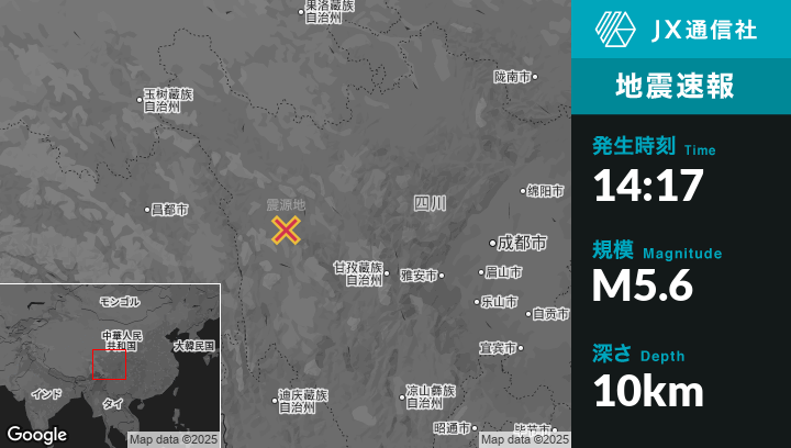 | 震源地 | 中国のDaochengから北210kmの地点 |