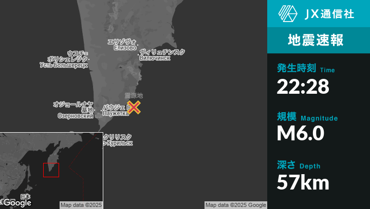 10月09日 22:28頃、ロシアのOzernovskiyから東119kmの地点でM6.0の地震がありました。