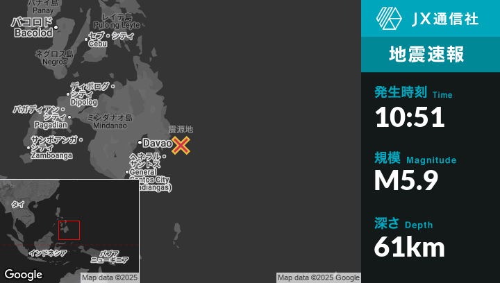 10月10日 10:51頃、フィリピンのManayから東南東40kmの地点でM5.9の地震がありました。
