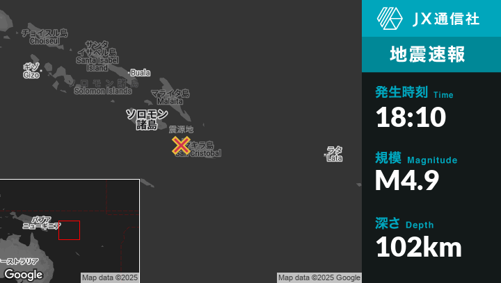 10月13日 18:10頃、ソロモン諸島のKirakiraから西北西73kmの地点でM4.9の地震がありました。