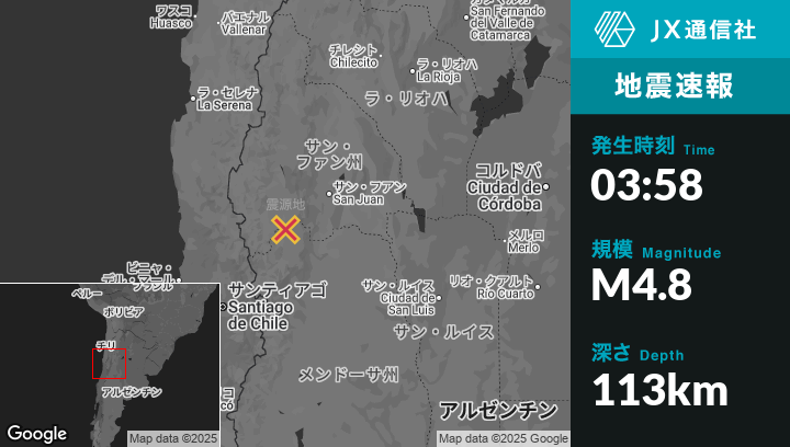 10月14日 03:58頃、アルゼンチンのCalingastaから南79kmの地点でM4.8の地震がありました。