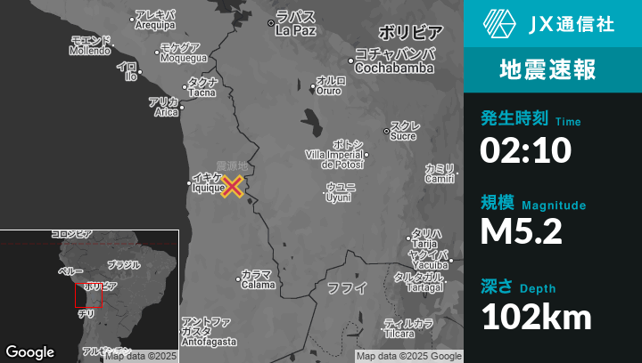 10月15日 02:10頃、チリのLa Tiranaから東北東61kmの地点でM5.2の地震がありました。
