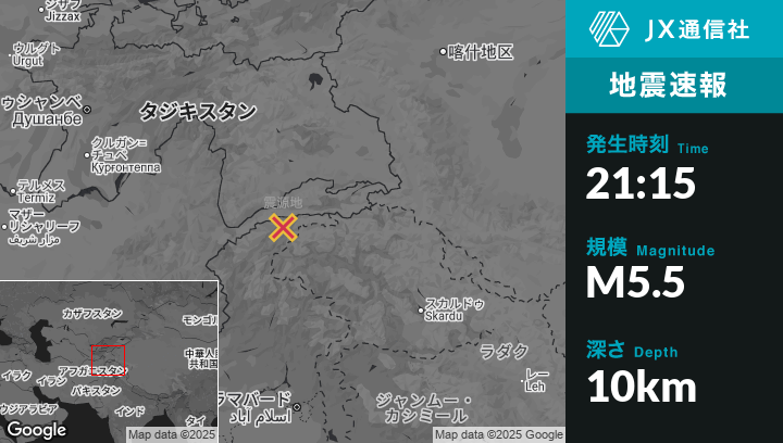 10月17日 21:15頃、アフガニスタンのKhandūdから東南東43kmの地点でM5.5の地震がありました。