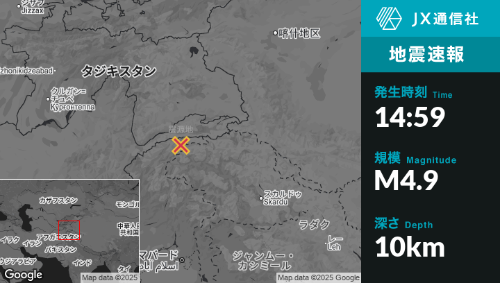 10月21日 14:59頃、アフガニスタンのKhandūdから東南東63kmの地点でM4.9の地震がありました。