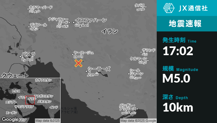 10月21日 17:02頃、イランのNūrābādから東北東47kmの地点でM5.0の地震がありました。