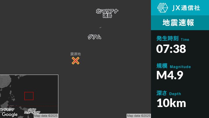 10月25日 07:38頃、グアムのMerizo Villageから南西217kmの地点でM4.9の地震がありました。