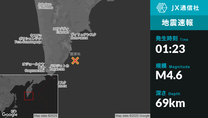 10月27日 01:23頃、ロシアのVilyuchinskから南南東120kmの地点でM4.6の地震がありました。