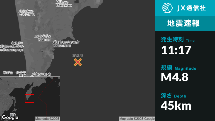 10月29日 11:17頃、ロシアのPetropavlovsk-Kamchatskyから南東147kmの地点でM4.8の地震がありました。