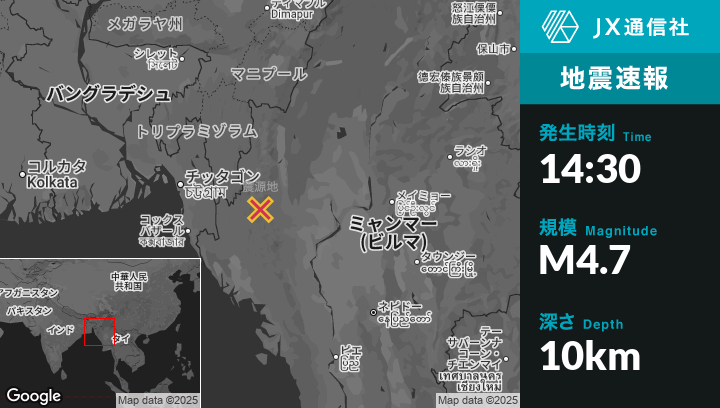 10月29日 14:30頃、ビルマ(ミャンマー)のHakhaから南73kmの地点でM4.7の地震がありました。