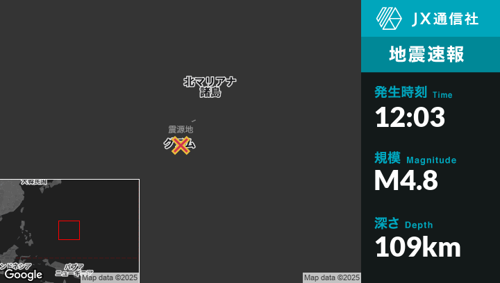 11月05日 12:03頃、グアムのDededo Villageから西北西3kmの地点でM4.8の地震がありました。
