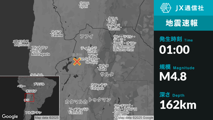 | 震源地 | アルゼンチンのSan Antonio de los Cobresから西65kmの地点 |
