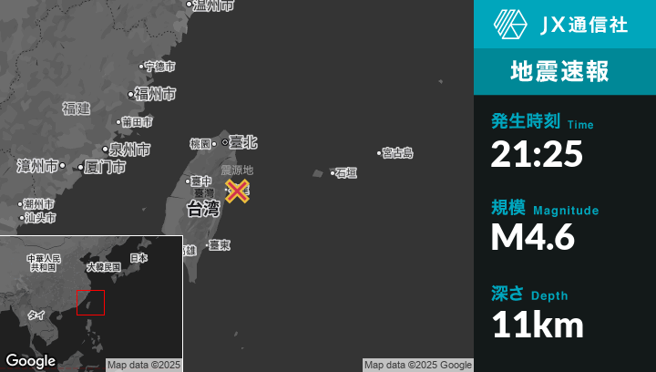 11月19日 21:25頃、台湾のHualien Cityから東北東27kmの地点でM4.6の地震がありました。