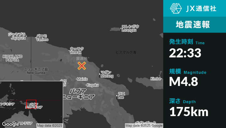 震源地パプアニューギニアのAngoramから南東72kmの地点