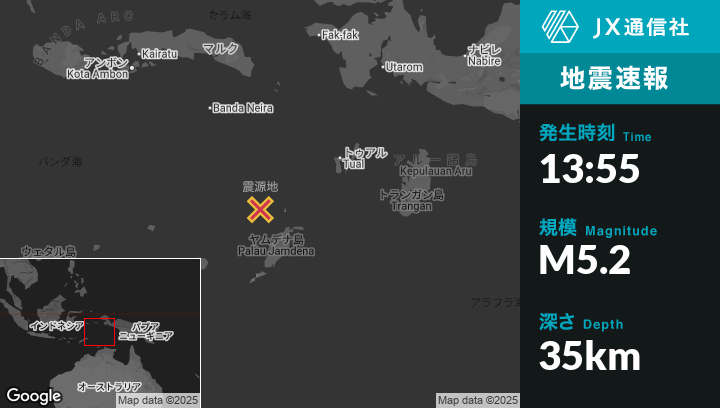 | 震源地 | インドネシアのTualから西南西221kmの地点 |