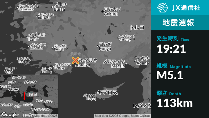 12月08日 19:21頃、トルコのKocaalilerから南南東23kmの地点でM5.1の地震がありました。