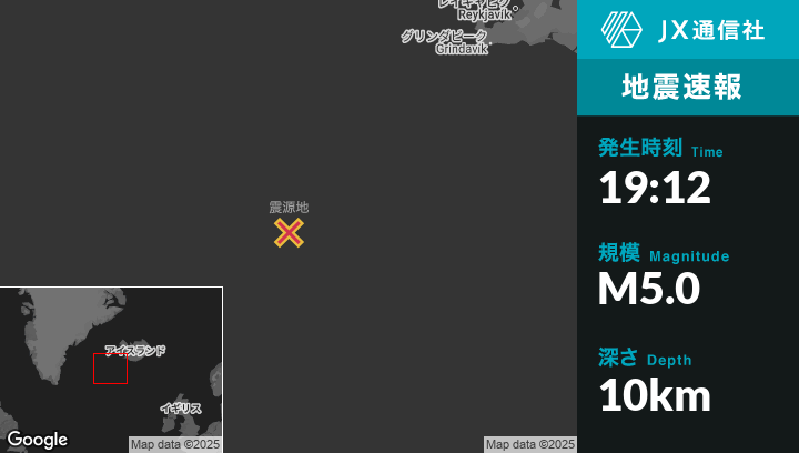 12月09日 19:12頃、アイスランドのGrindavíkから南西272kmの地点でM5.0の地震がありました。