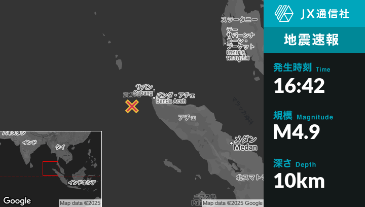 12月10日 16:42頃、インドネシアのBanda Acehから西南西111kmの地点でM4.9の地震がありました。