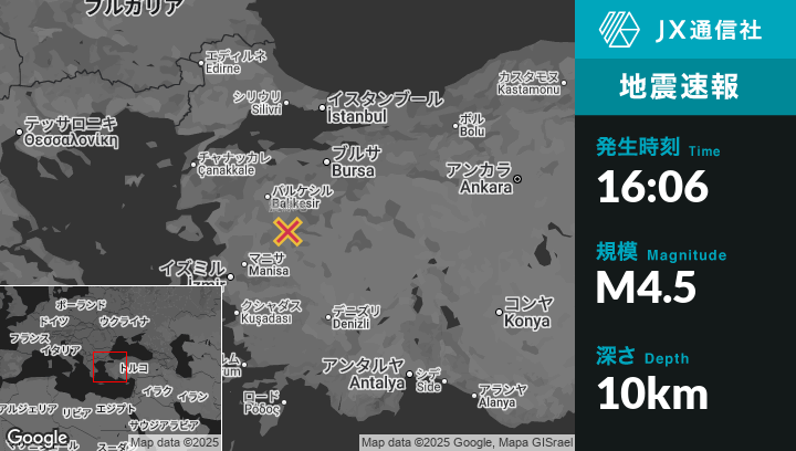 12月11日 16:06頃、トルコのSındırgıから東南東9kmの地点でM4.5の地震がありました。