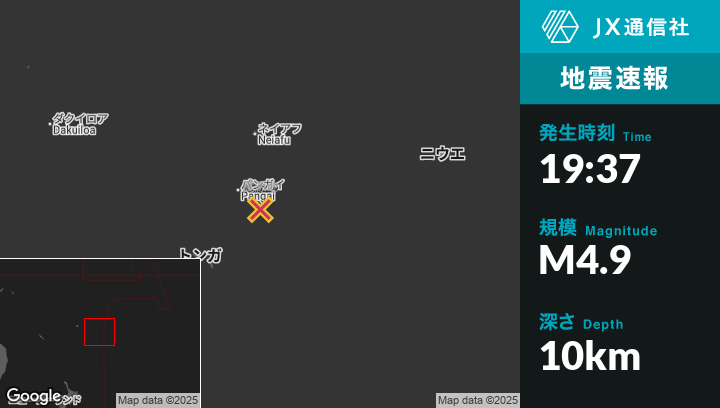 12月11日 19:37頃、トンガのPangaiから東南東59kmの地点でM4.9の地震がありました。
