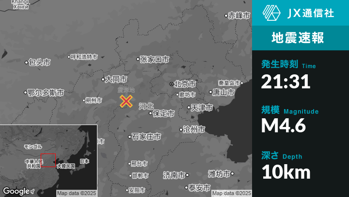 12月22日 21:31頃、中国のBeitanzhuangから北98kmの地点でM4.6の地震がありました。