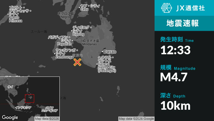 1月28日 12:33頃、フィリピンのSangayから西32kmの地点でM4.7の地震がありました。