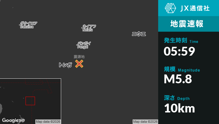 2月01日 05:59頃、トンガの‘Ohonuaから東北東91kmの地点でM5.8の地震がありました。
