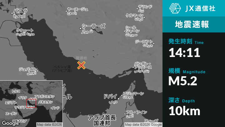2月01日 14:11頃、イランのMohrから西南西27kmの地点でM5.2の地震がありました。