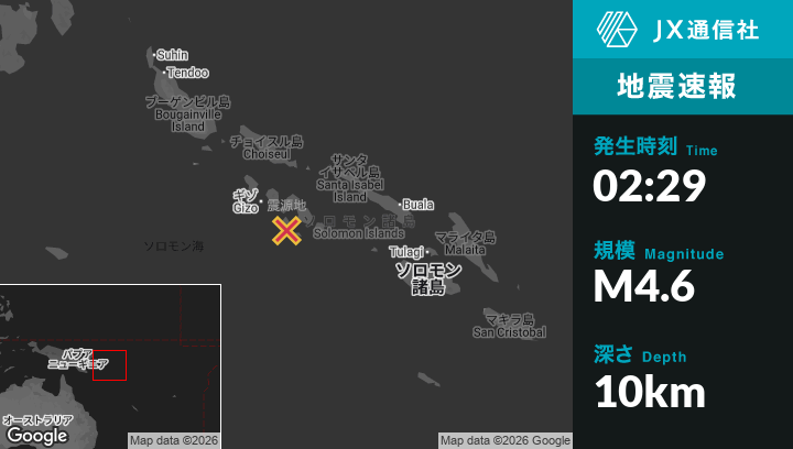 2月03日 02:29頃、ソロモン諸島のGizoから南東75kmの地点でM4.6の地震がありました。