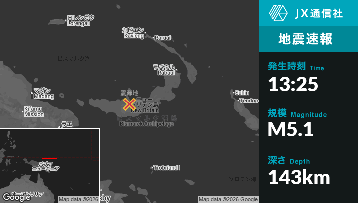| 震源地 | パプアニューギニアのKimbeから南西8kmの地点 |