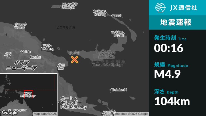 | 震源地 | パプアニューギニアのFinschhafenから北東76kmの地点 |