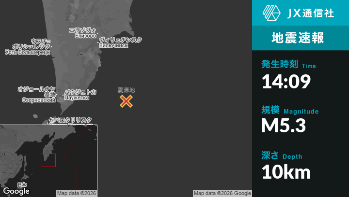 2月09日 14:09頃、ロシアのVilyuchinskから南南東194kmの地点でM5.3の地震がありました。