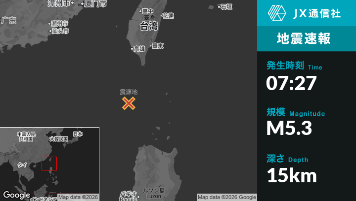 2月12日 07:27頃、台湾のHengchunから南南西179kmの地点でM5.3の地震がありました。