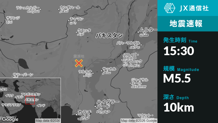 2月13日 15:30頃、パキスタンのKhuzdarから北東79kmの地点でM5.5の地震がありました。
