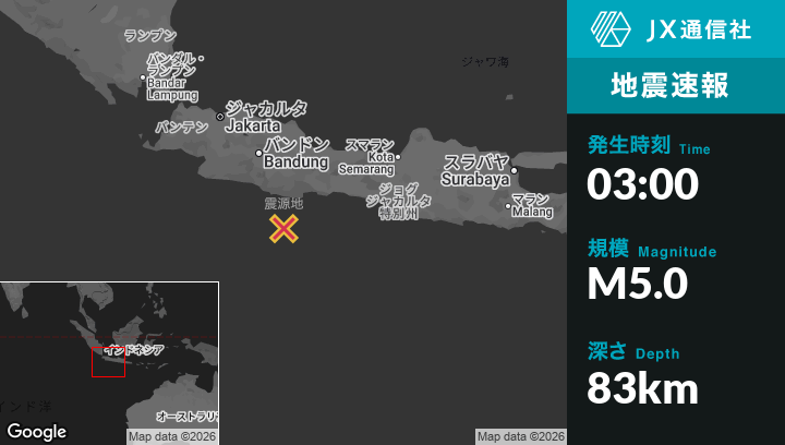| 震源地 | インドネシアのKawaluから南101kmの地点 |