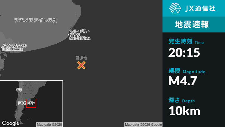 | 震源地 | アルゼンチンのMar del Plataから南南東193kmの地点 |