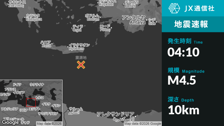 | 震源地 | ギリシャのIerápetraから南南東74kmの地点 |