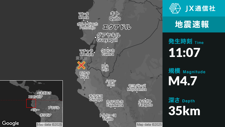 5月11日 11:07頃、ペルーのPapayalから西北西16kmの地点でM4.7の地震がありました。