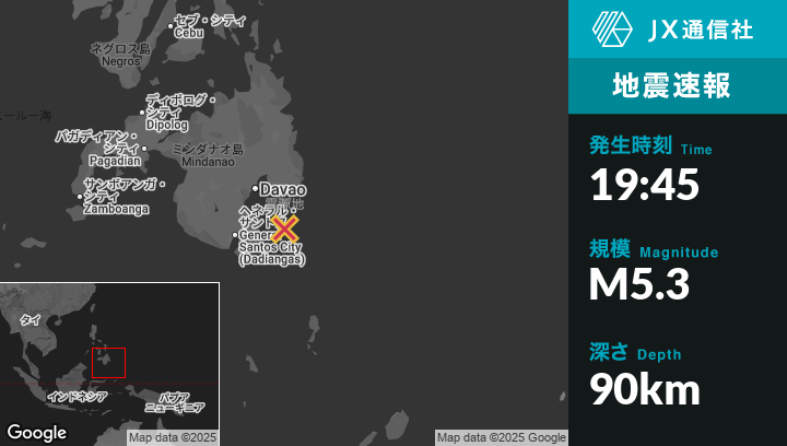 11月25日 19:45頃、フィリピンのPondaguitanから北東2kmの地点でM5.3の地震がありました。