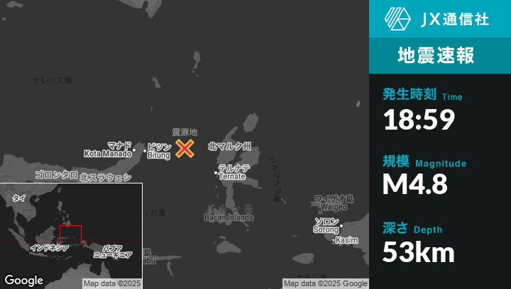 11月27日 18:59頃、インドネシアのBitungから東143kmの地点でM4.8の地震がありました。