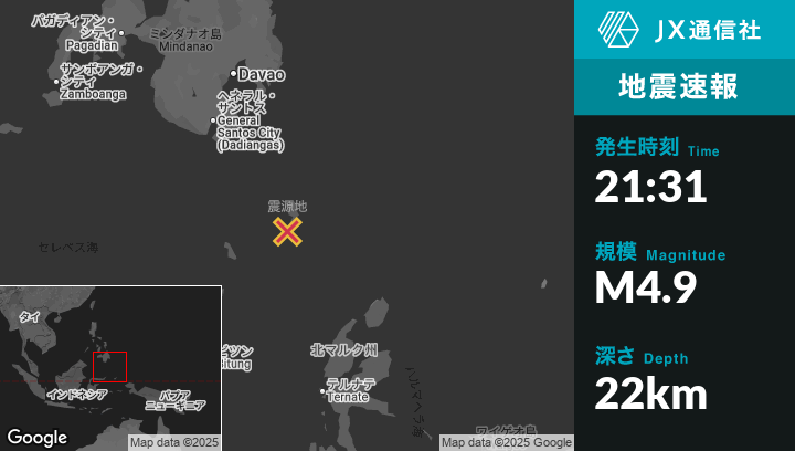 | 震源地 | フィリピンのSaranganiから南東199kmの地点 |