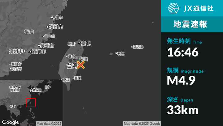 12月23日 16:46頃、台湾のHualien Cityから南25kmの地点でM4.9の地震がありました。