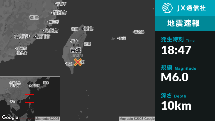 12月24日 18:47頃、台湾のYujingから東南東82kmの地点でM6.0の地震がありました。